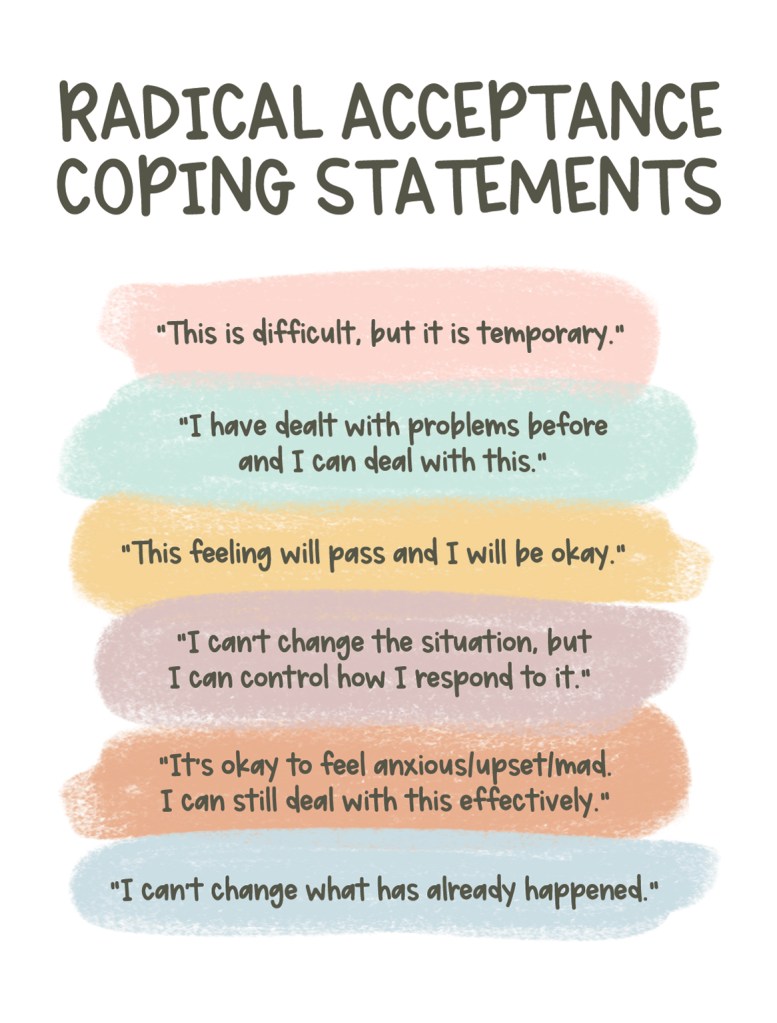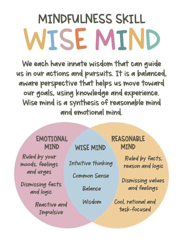 DBT teaches us to slow down enough to know what we are actually thinking. To be able to trace a thought back. It’s the same way we talk to or teach children who are having “big feelings.” We help them to understand and identify their feelings, to be informed by them. It is reparenting the language of our traumatized stuck child, so we can continue the journey integrated. No parts left behind.